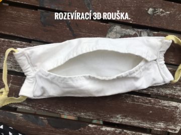 3D rouška: Dvouvrstvá rouška specifického střihu. Rozevírá se zvlášť na ústa a nos. Pohodlná při mluvení a celkovém nošení. Dobře padne různým typům obličeje. Bez kapsy na filtr.